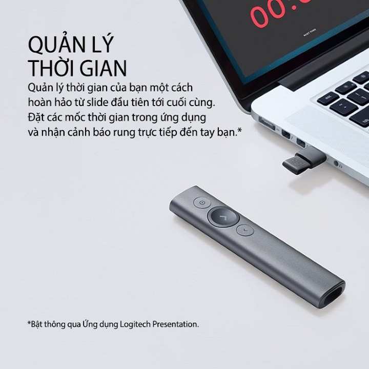 THỜI LƯỢNG PIN SỬ DỤNG KHI SẠC ĐẦY LÊN ĐẾN 3 THÁNG, VÀ SPOTLIGHT CÒN CÓ MỘT TÍNH NĂNG ĐỘC ĐÁO NỮA, ĐÓ LÀ BẠN CÀI ĐẶT THỜI GIAN KỂ TỪ KHI BẮT ĐẦU TRÌNH CHIẾU ĐẾN KHI KẾT THÚC THÔNG QUA ỨNG DỤNG LOGITEC PRESETATION APP, THIẾT BỊ SẼ RUNG LÊN THÔNG BÁO CHO BẠN BIẾT ĐÃ ĐẾN LÚC ĐỂ KẾT THÚC.