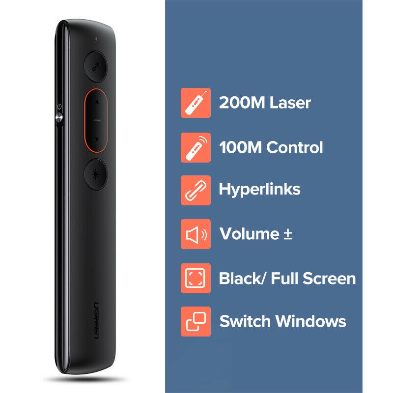 Bút Trình Chiếu Laser lên đến 100m Cao Cấp Ugreen 60327 - Hàng Chính HãngBút Trình Chiếu Laser Không Dây Điều Khiển Từ Xa 100m Cao Cấp Ugreen 60327 là thiết bị dùng để khiển từ xa nội dung thuyết trình trên màn hình máy tính, máy chiếu phục vụ cho các cuộc họp, hội nghị