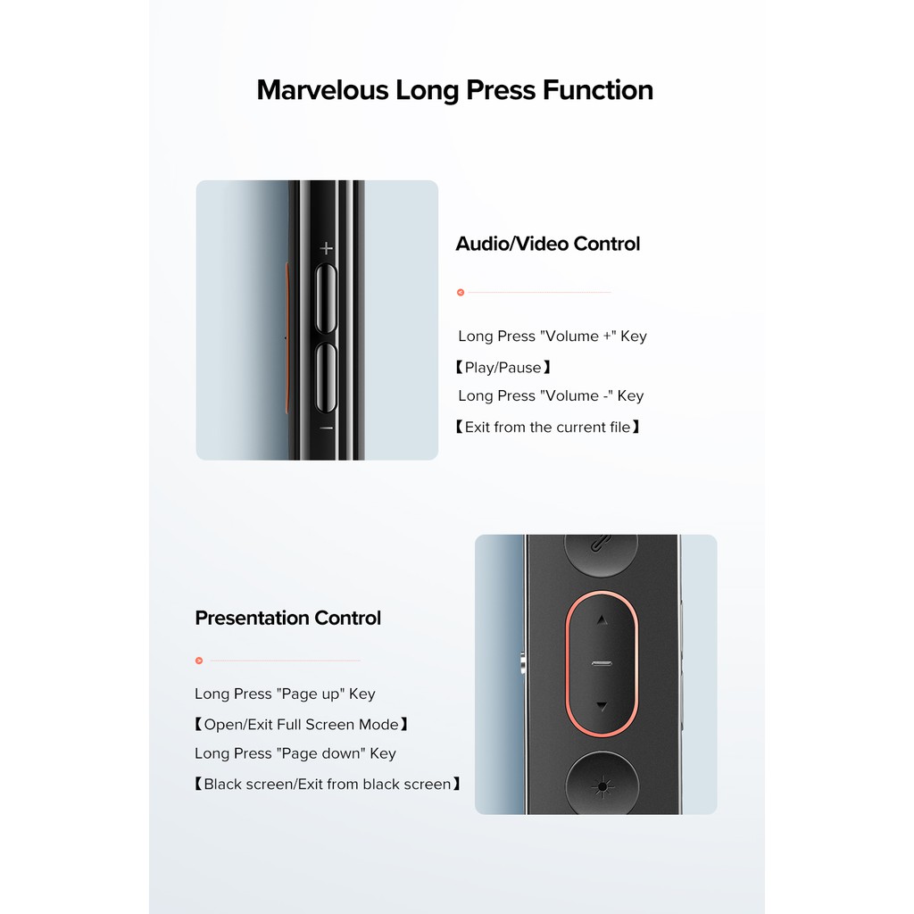 Trang bị đầy đủ tính năng: Đèn Laser, Lật trang lên xuống, Chuyển đổi Windows, Tăng giảm âm lượng, Mở và đóng màn hình