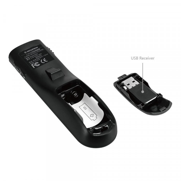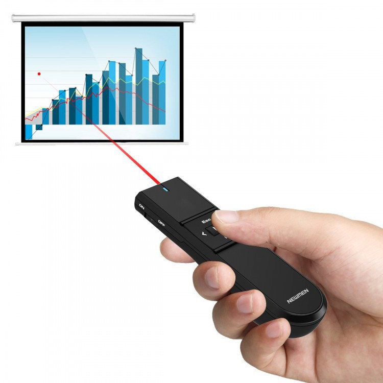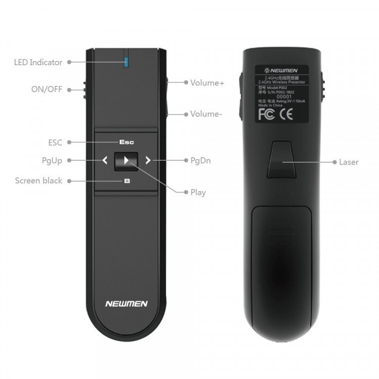 Bút trình chiếu Laser Newmen P002Bút trình chiếu, thuyết trình dùng với máy chiếu hoặc màn ảnh rộng. Kiểu dáng nhỏ gọn dễ mang theo bên mình , các góc sản phẩm được bo tròn mềm mại , chất liệu nhựa cao cấp chống xước, chống trơn trượt đảm bảo sự chắc chắn khi thao tác, điều khiển, công nghệ wireless 2.4GHz, phím bấm âm thanh lên xuống, qua lại giữa các trang được bố trí thông minh, dễ sử dụng.