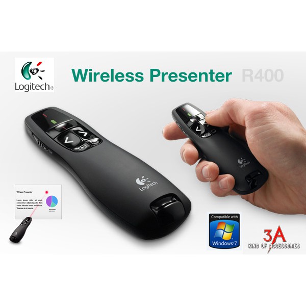 Bút trình chiếu logitech r400Logitech được biết đến như một nhà sản xuất những thiết bị ngoại vi có chất lượng cũng như ứng dụng nhiều tính năng hiện đại hàng đầu thế giới. Chính vì vây, khi Logitech cho ra mắt sản phẩm bút trình chiếu đã thu hút một lượng lớn người tiêu dùng cùng như các chuyên gia trên toàn thế giới. Bút trình chiếu Logitech Wireless Presenter R400 được tích hợp khả năng kết nối không dây với sóng 2.4Ghz mạng mẽ và phạm vi kết nối lên đến 15m, cho người dụng được thoải mái di chuyển khắp phòng. Ngoài ra, trên bút Logitech Wireless Presenter R400 còn hỗ trợ đèn laser để bạn có thể chỉ dẫn chính xác vào nội dung mà mình muốn trình bày trên slide, giúp người xem tập trung và dễ dàng theo kịp buổi thuyết trình của bạn. Với những ưu điểm nổi bật ấy, bút trình chiếu tự tin sẽ giúp bạn có một buổi thuyết giảng thành công.