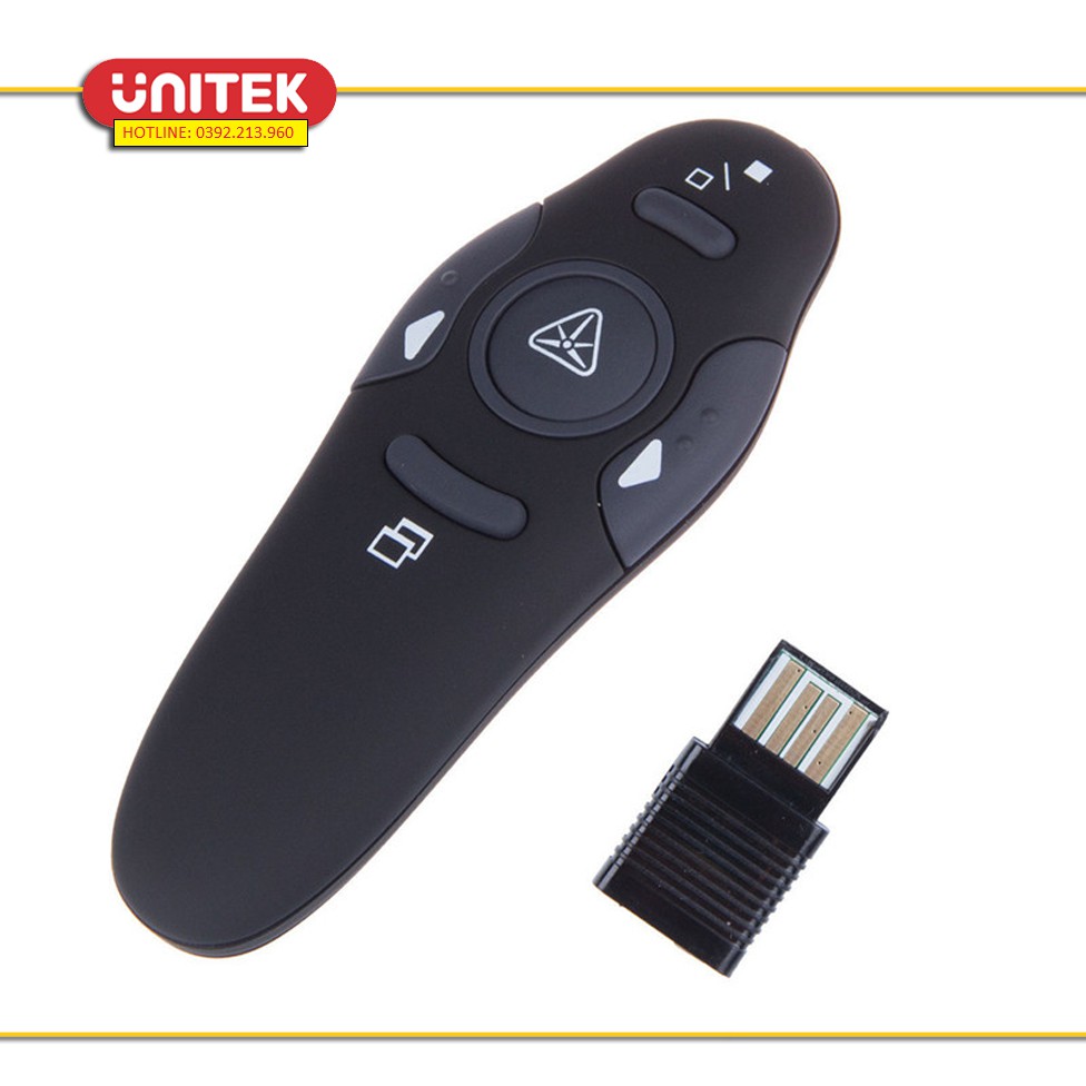 Bấm phím tròn ở chính giữa để bật đèn laser đỏ khi thuyết trình. Phím chức năng phía sau nút tròn (ký hiệu 2 hình chữ nhật lồng vào nhau) đê bật và tắt show slide. Phím chức năng phía trước nút tròn (Ký hiệu 2 ô vuông tách rời) dùng đẻ tắt đen màn hình khi không cần thiết. Bấm phím này 1 lần nữa để gọi lại màn hình làm việc.