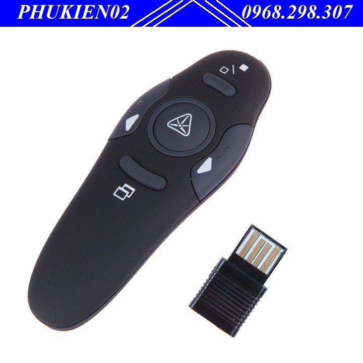 Bấm phím tròn ở chính giữa để bật đèn laser đỏ khi thuyết trình. Phím chức năng phía sau nút tròn (ký hiệu 2 hình chữ nhật lồng vào nhau) đê bật và tắt show slide. Phím chức năng phía trước nút tròn (Ký hiệu 2 ô vuông tách rời) dùng đẻ tắt đen màn hình khi không cần thiết. Bấm phím này 1 lần nữa để gọi lại màn hình làm việc.