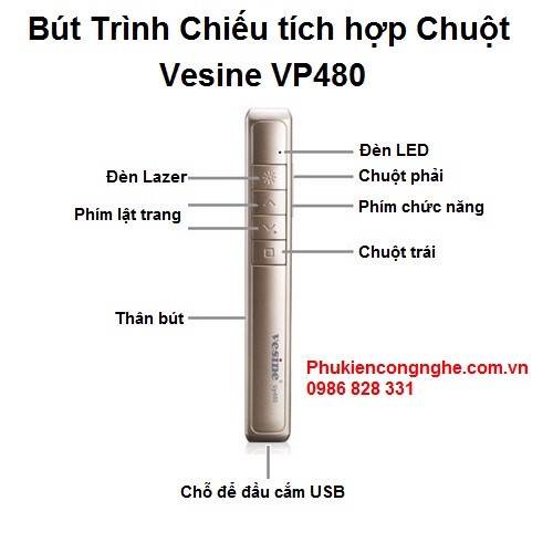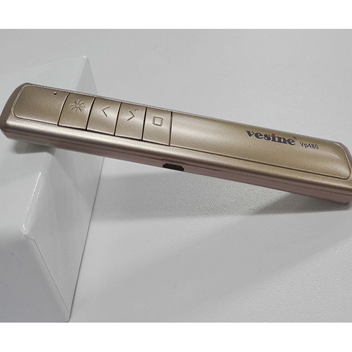 Bút trình chiếu Vesine VP480 (Vàng đồng)Bạn chán việc phải ngồi trên bàn để di chuột điều khiển. Bạn chán việc phải đi tìm điều khiển vì có quá nhiệu loại. Chúng tôi xin giới thiệu Bút trình chiếu VESINE VP480 kết hợp với chuột bay với 2 tính năng trong 1: chuột bay, điều khiển Laser để thuyết trình.