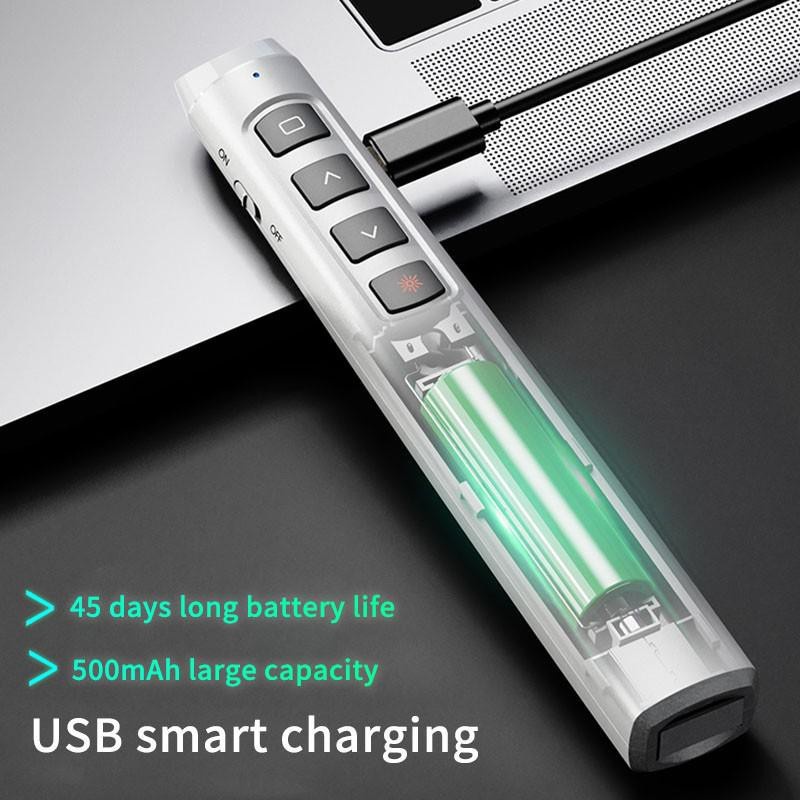 Đèn đỏ sáng - Điều khiển từ xa demo đi kèm với ánh sáng rực rỡ, dễ nhìn thấy ở hầu hết các hình nền (không nên sử dụng cho màn hình LED, LCD), làm nổi bật các điểm chính của trình chiếu để bạn có thể tương tác với khán giả, để họ chú ý đến PPT. Được cung cấp bởi 1x pin AAA và không bao gồm pin
