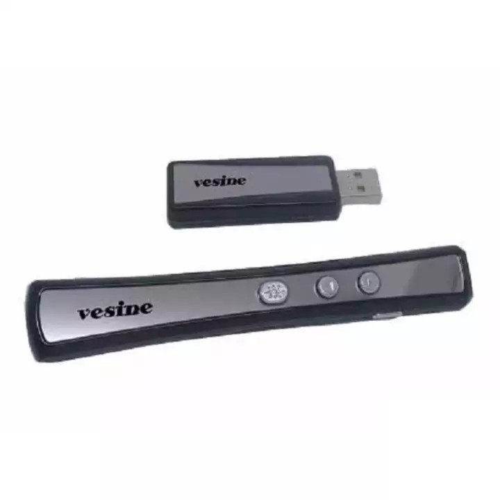 Bút trình chiếu Laser Wireless Presenter VESINE PP900 không dây là dụng cụ đặc biệt dùng trong các bài thuyết trình PowerPoint. Giao tiếp cổng USB chức năng lật trang lên xuống, phạm vi hoạt động 15m, nó sẽ là người cộng tác tuyệt vời cho buổi thuyết trình chuyên nghiệp của bạn. Nó cho phép bạn dùng điều khiển chuyển đổi các slide tới hoặc lui và dùng tia laser để nhấn mạnh các điểm chú ý trong bài thuyết trình mà không cần phải dùng đến bàn phím máy tính, chuột, que chỉ, hay phải ra hiệu cho đồng nghiệp của bạn chuyển đổi các slide giúp bạn. Bạn có thể di chuyển quanh căn phòng để điều chỉnh slide và thuyết trình. PowerPoint, ACDSee, Excel, Word