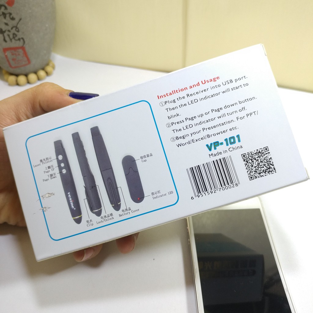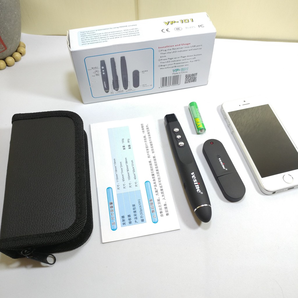- Bộ sản phẩm gồm: 1 x Bút trình chiếu Vesine VP101, 1 x USB thu phát sóng, 1 x Vỏ bao đựng