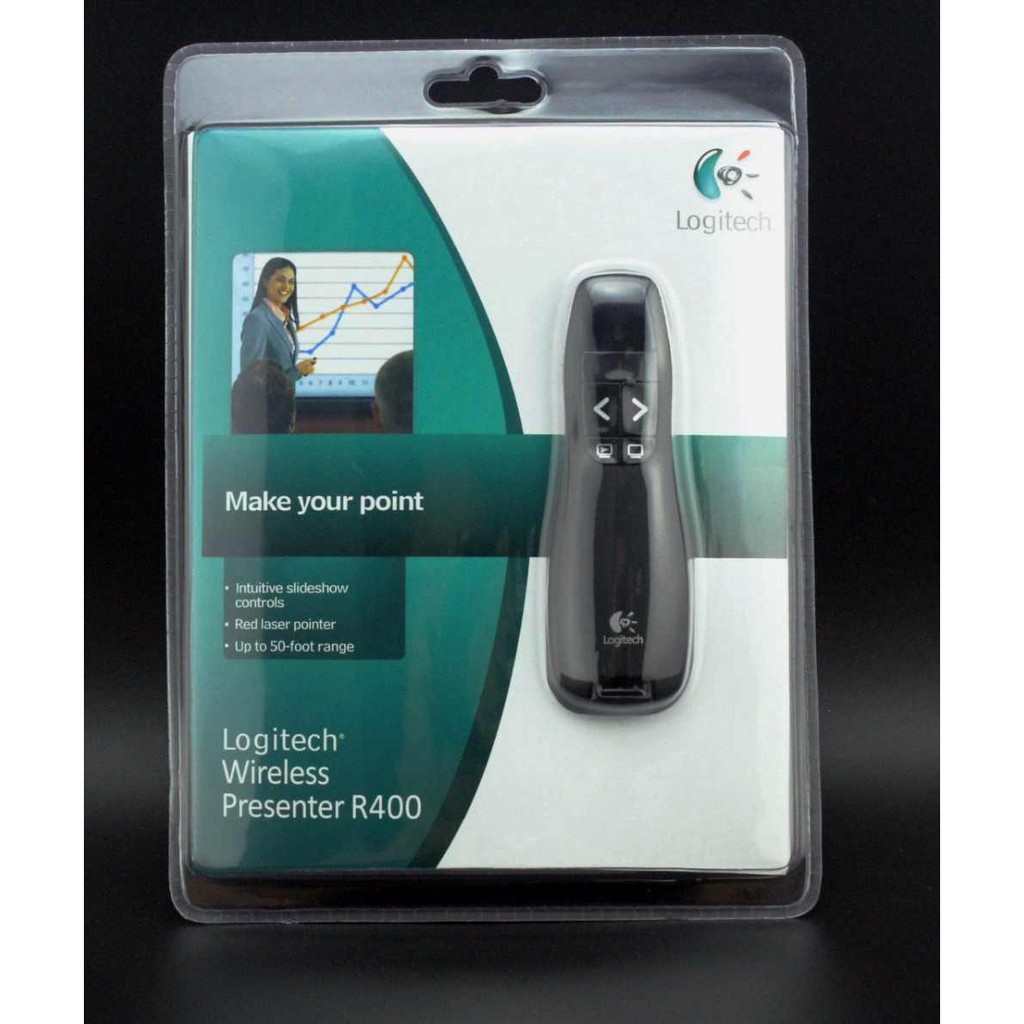 Bút trợ giảng Logitech R400 chất lượng cao tại Hà nộiBút trợ giảng Logitech R400 được thiết kế một phong cách chuyên nghiệp cho thuyết trình, giúp bạn có thể thoải mái di chuyển trong phòng để thuyết giảng mà không cần lo ngại về khoảng cách, bật nhanh chương trình PPT chỉ cần bằng một thao tác Click, hoặc tạm thời tắt màn hình , Bạn cũng không phải lo sợ về thời gian trình chiếu vì bút được tích hợp chức năng báo trước để bạn tự quản lý được thời gian trình chiếu.