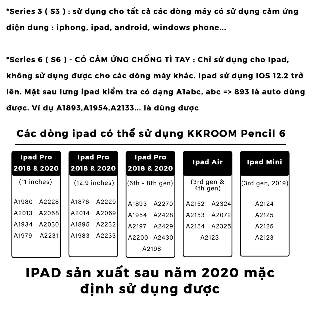 *S6 : Cảm ứng chống tì tay rất phù hợp với những người làm việc về digital, chỉnh sửa, edit, artist... ( khi tì tay màn hình máy sẽ nhận diện được tay và bút ): CHỈ DÙNG ĐƯỢC cho các dòng Ipad có đuôi đằng sau là A1893 trở lên ( VD: A1954, A202x, A21x.... ) và tương thích với hệ điều hành IOS từ 12.2 trở lên. Các dòng Iphone, Android, window phone hoặc Ipad sản xuất trước 2018 hoặc đời thấp hơn A1893 đều KHÔNG SỬ DỤNG ĐƯỢC.