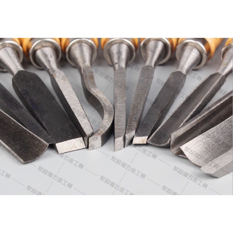 Bộ đục gỗ 12 món Lưỡi bằng thép (65# manganese steel), có độ bền cao, cạnh rất bén (sắc);