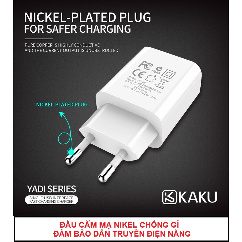 Cốc sạc nhanh KAKU - Chuẩn QUICK CHARGE 3.0A 18W - sạc chống cháy cách nhiệt - Củ sạc nhanh cục sạc nhanh