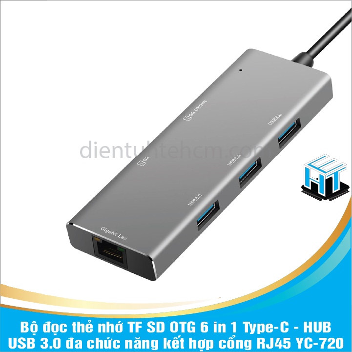 Bộ đọc thẻ nhớ TF SD OTG 6 in 1 Type-C - HUB USB 3.0 đa chức năng kết hợp cổng RJ45 YC-720