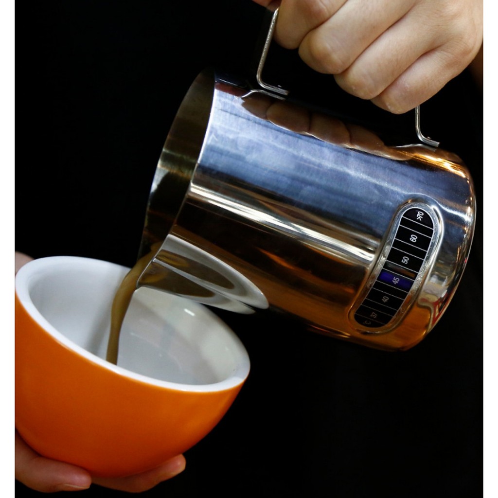 Với thiết kế vòi rót nhỏ, dung tích lớn 600ml. Cùng vạch chia nhiệt độ hiển thị nhiệt độ sữa trong quá trình tạo bọt sữa làm latte, cappucino.
