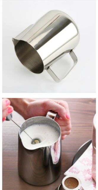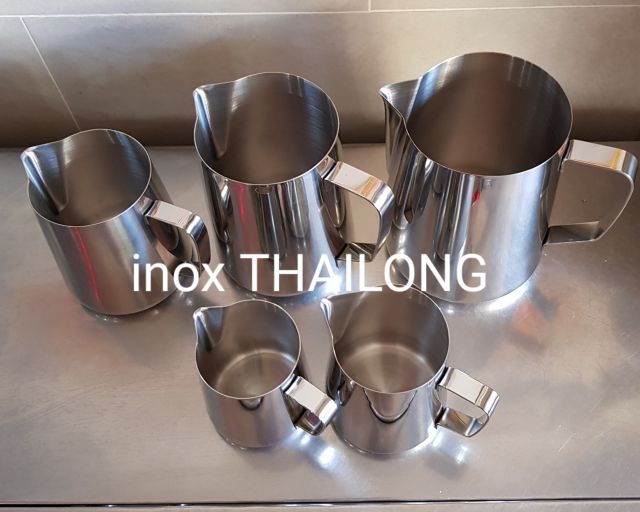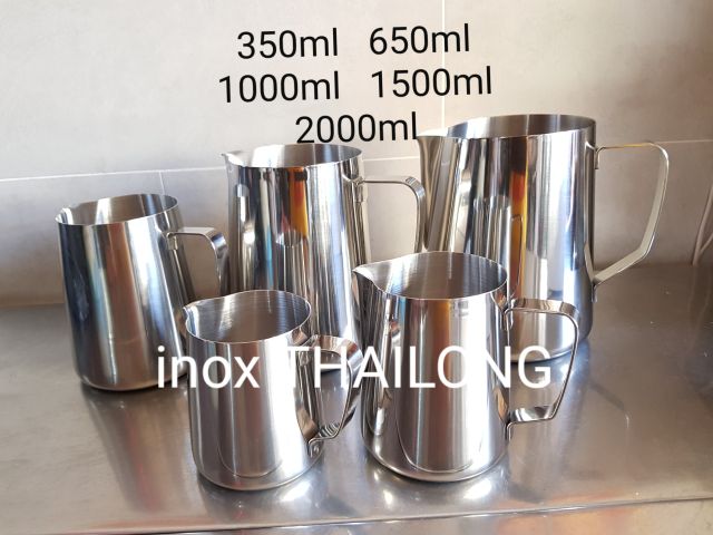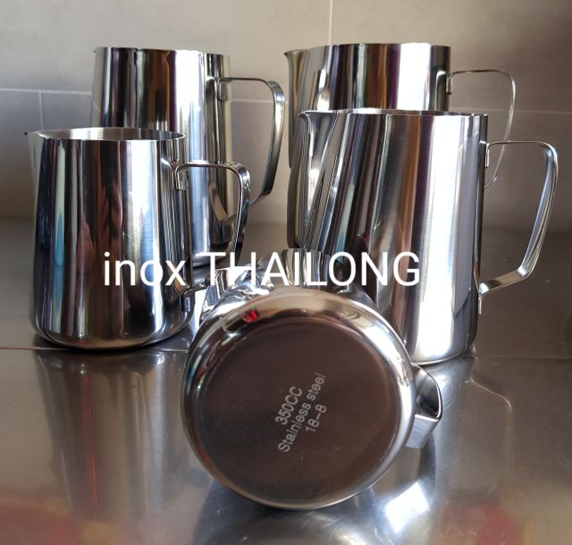 Ca đánh sữa inox cao cấp có đủ kích cở. Dùng cho gia đình hoặc quầy bar. Mình chuyên bỏ sỉ số lượng lớn ai cần liên hệ mình 0906777674Đắc lực cho barista trong việc tạo hình cho tách Cappuccino, Latte hay Macchiatto.