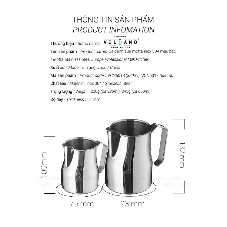 Tên sản phẩm: Ca đánh sữa Motta màu bạc Inox 304 mũi tròn- Công ty chịu trách nhiệm về hàng hóa: CÔNG TY TNHH CÀ PHÊ VOLCANO