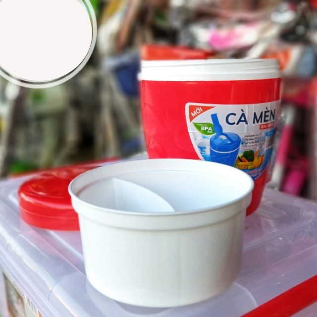 Cà mèn hay cạp lồng nhựa 2 lớp dùng đựng cơm, bún, phở, hủ tíu, cháo v.v...• Nhựa 2 lớp giúp việc cầm không nóng tay, ngoài ra còn có thể giữ được thức ăn được nóng ấm lâu hơn.