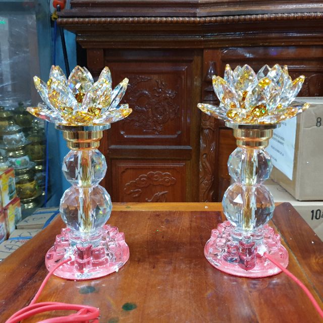 Cặp đèn thờ đá pha lê 202 cao cấp tự động đổi màu cao 23 cm