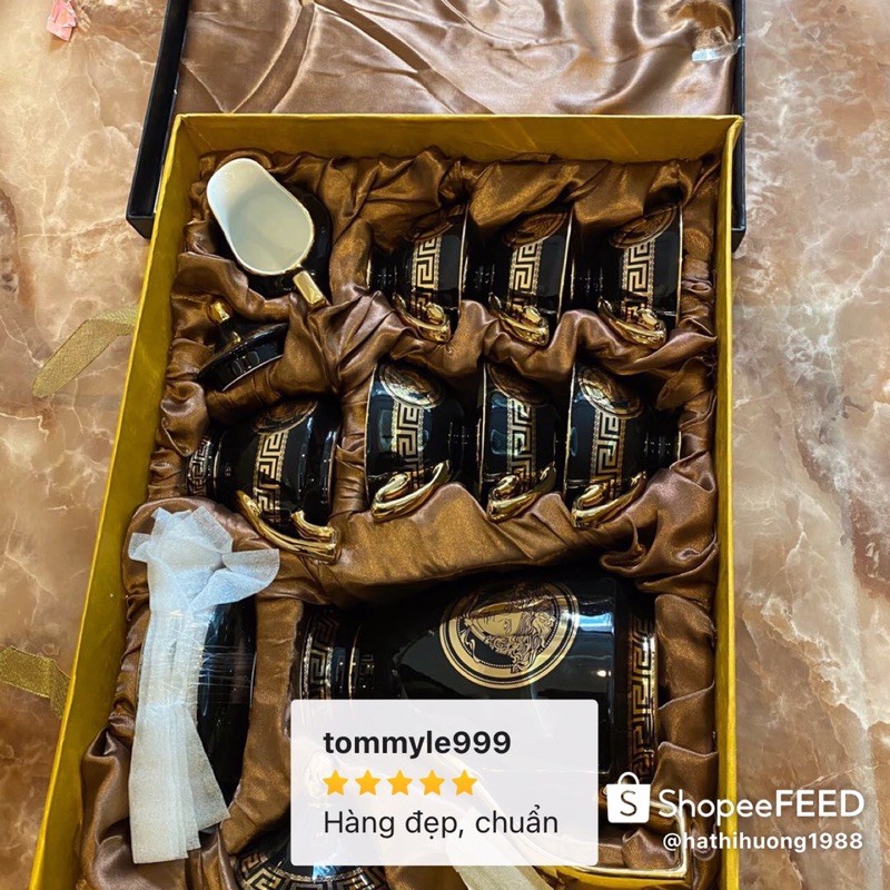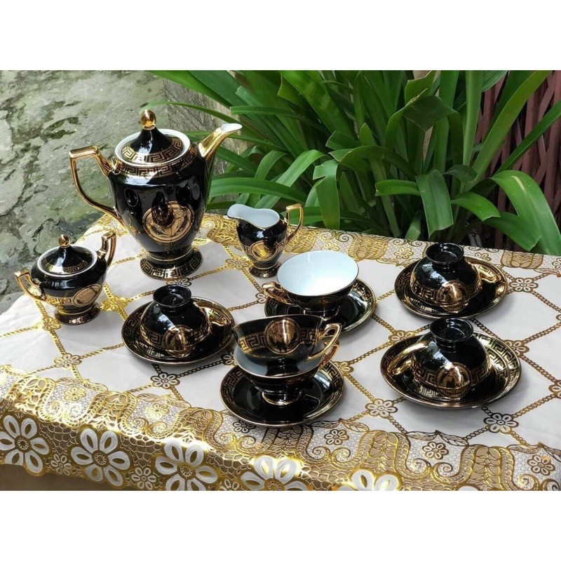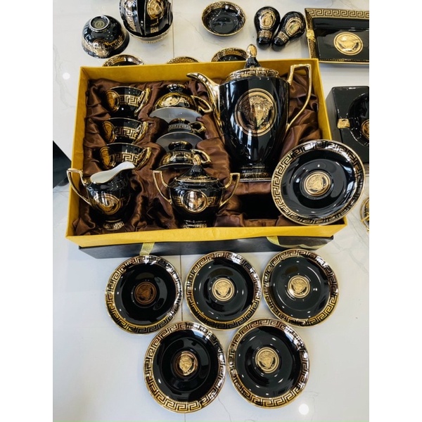 - Bộ trà Versace với kiểu dáng sang trọng, tông màu đen, thiết kế hoa văn đẹp mắt, tất cả các viền vàng đều được mạ vàng 24K vô cùng tinh xảo và tỉ mỉ