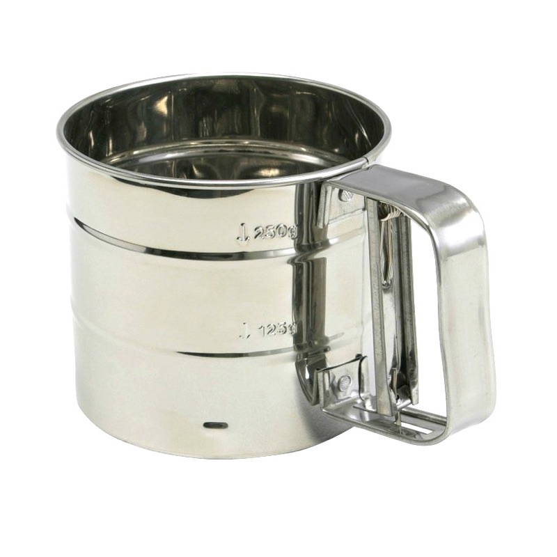 - Ứng dụng: Cốc rây bột giúp bạn dễ dàng ray bột làm bánh mịn màng, hoặc rắc cacao, trà xanh trang trí bánh. Thiết kế tay cầm rây dễ sử dụng, bền chắc và vô cùng tinh tế.