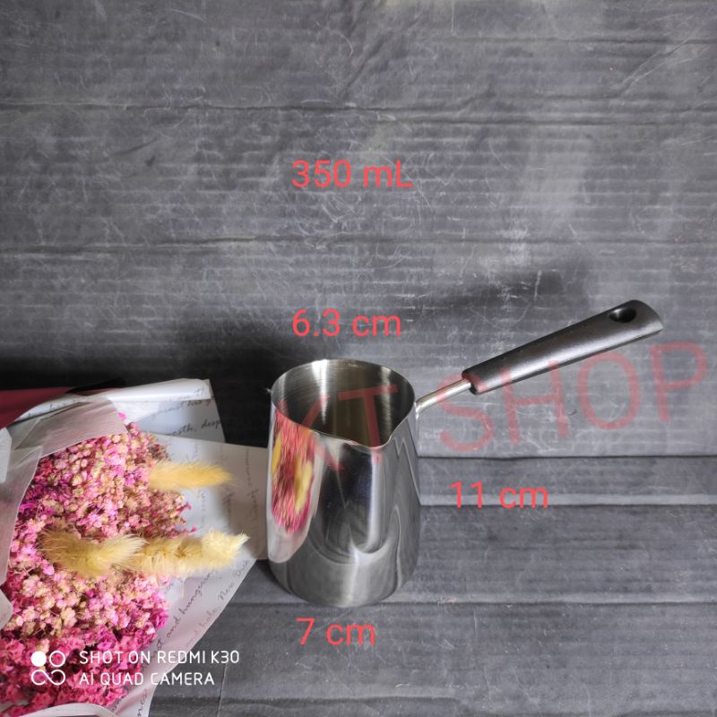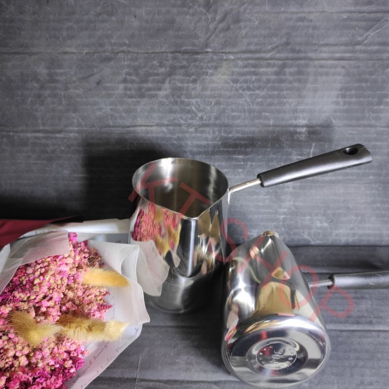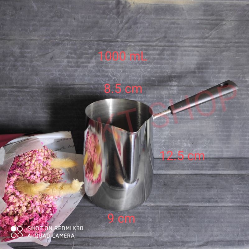 Chất liệu Inox 304 không gỉ sét an toàn vệ sinh thực phẩm. Cán cầm bằng nhựa PP màu đen chắc chắn và chống nóng.Dung tích gồm 350 ml, 600 ml và 1000 ml