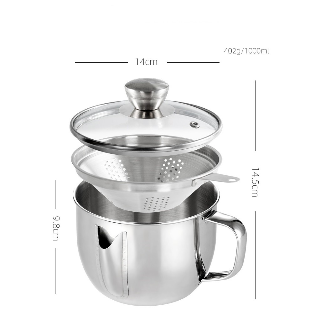 Ca rót súp lọc dầu Inox 304 2 đầu có nắp kính không kèm đồ lọc - 14x14.5cm 402g 1000ml