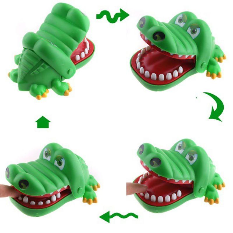 →Cá sấu có nhiều răng,người chơi lần lượt nhấn vào từng cái răng,khi nhấn vào răng của cá sấu mà vào trúng cái răng sâu thì sẽ nghe tiếp "khập", đồng thời ngón tay sẽ bị cá sấu "ngậm", và người đó chính là người thua cuộc.