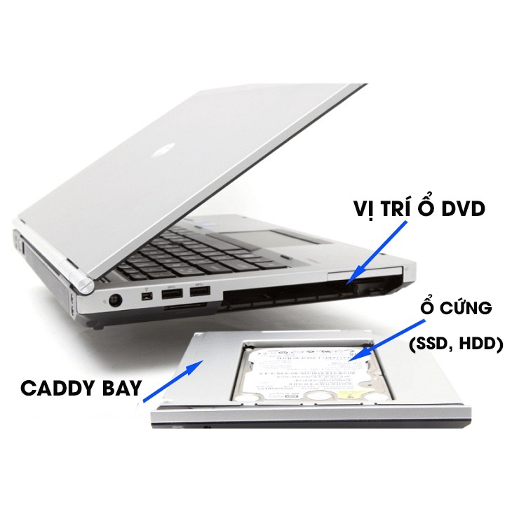 - Caddy Bay được gắn thay cho vị trí của ổ DVD (thường rất ít dùng, hầu như là chẳng bao giờ sử dụng ổ đĩa DVD).