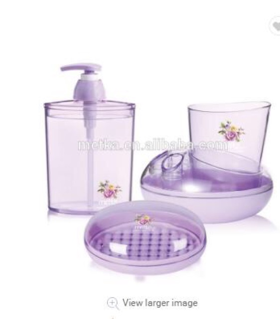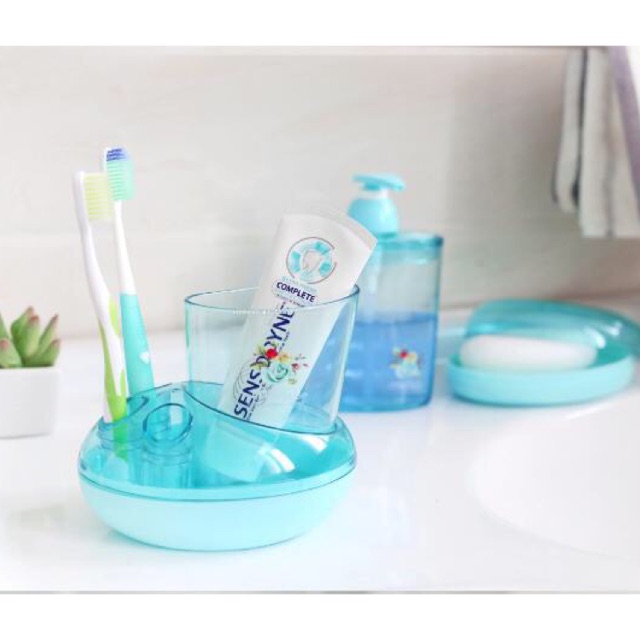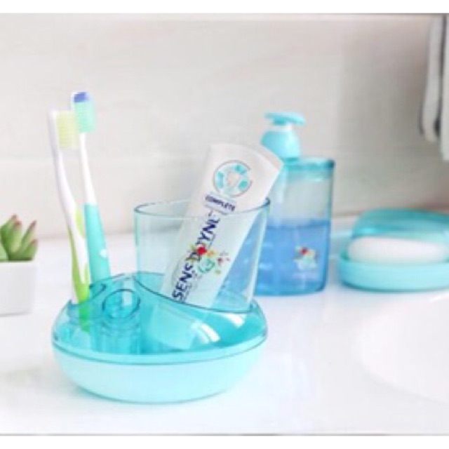 -Bộ gồm 3 món giá cắm bàn chải + hộp để xà phòng bánh + bình vòi đựng nước rửa tayThiết kế xinh xắn , tiện dụng thích hợp với không gian nhỏ gọn của nhà tắm