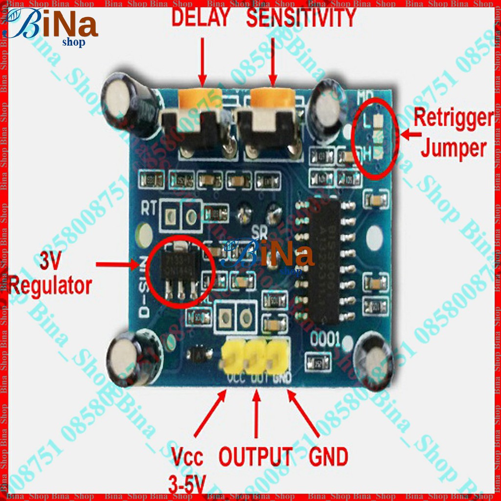 Ngoài ra cảm biến còn có thể điều chỉnh thời gian kích trễ (giữ tín hiệu bao lâu sau khi kích hoạt) qua biến trở tích hợp sẵn.