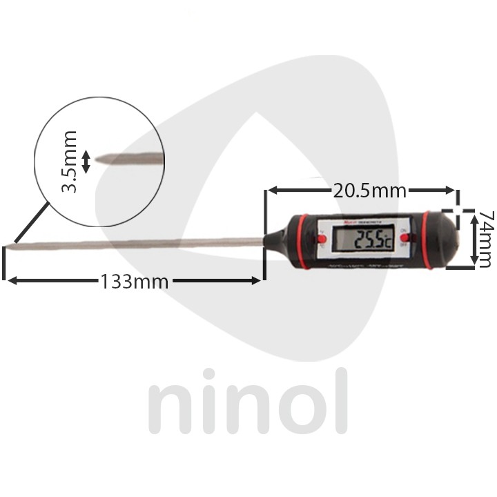 Cảm biến nhiệt độ điện tử được sản xuất nhầm mục đích hỗ trợ việc đo nhiệt độ của thực phẩm. Vì thế mà thiết kế của que nhiệt kế này khá là đặc biệt so với những que nhiệt kế dùng trong y tế hoặc nhiệt kế đo nhiệt độ phòng khác.