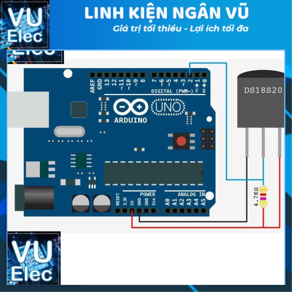 - Để đo được nhiệt độ ta cần thêm 1 điện trở 4.7k Ohm nối từ chân DQ lên VCC