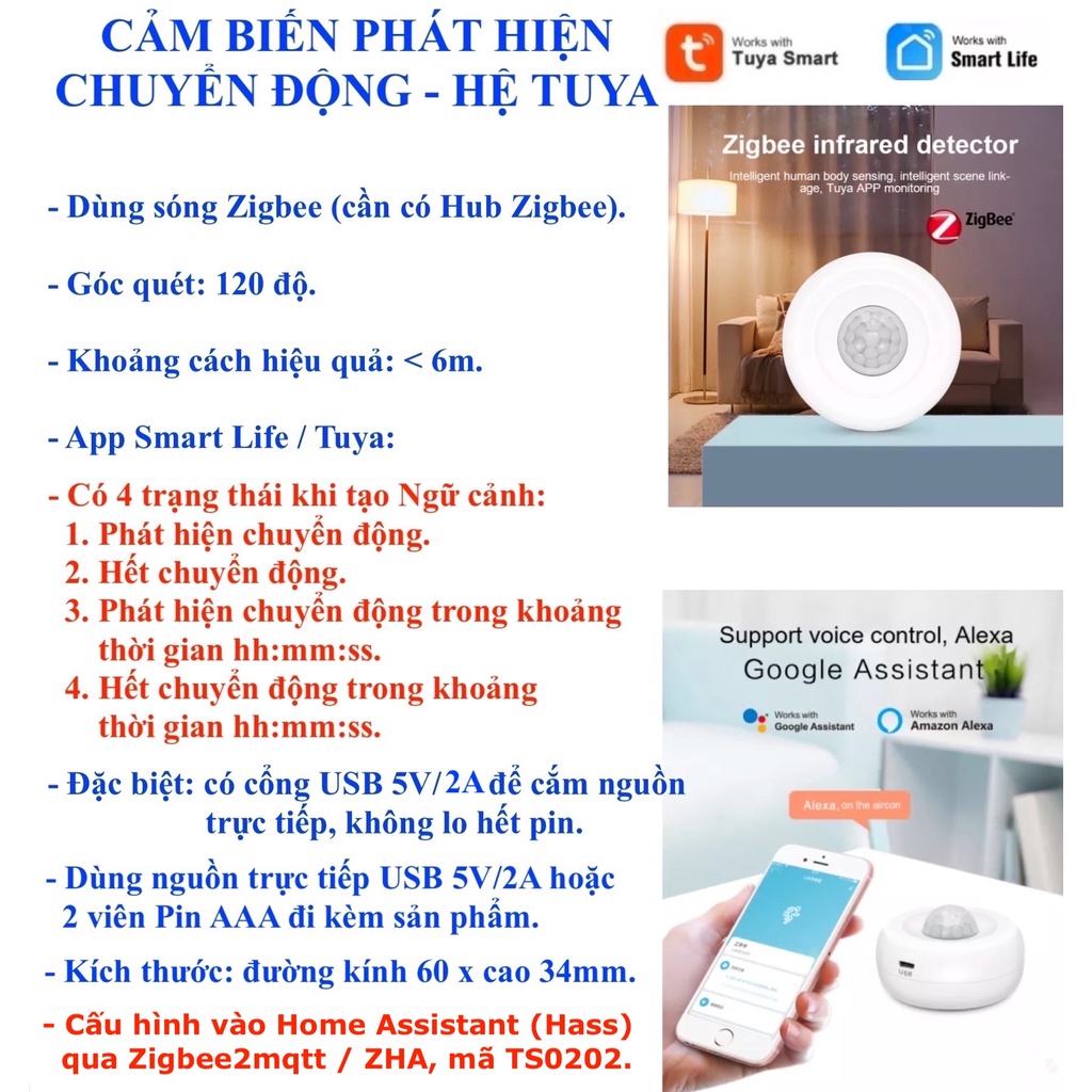 Cảm biến PIR phát hiện chuyển động, Zigbee, Hệ Tuya, Smart Life, Home Assistant -