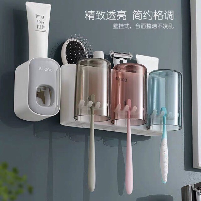 GIỚI THIỆU SP : kệ đựng 2 cốc 3 cốc và 1 nhả kem đánh răng ECOCO Cao cấpSản phẩm gồm dụng cụ nặn kem đánh răng tự động bên phải của ảnh. Chất liệu PVC bền, đẹp thân thiện với môi trường, an toàn với sức khỏe. - Dễ dàng thay đổi vị trí - Giữ cho bàn chải, cốc, kem đánh răng, sạch sẽ Phần để tuýp kem đánh răng là dạng nặn kem tự động, chỉ cần đưa đầu bàn chải vào nhấn nhấn là kem đánh răng chảy xuống, rất tiện Sử dụng công nghệ hút chân không hiện đại hút siêu dính, không cần khoan vít.