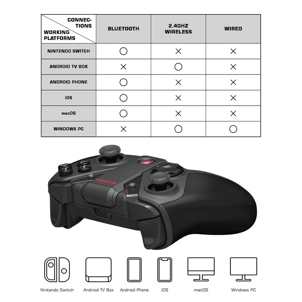 Nền tảng làm việc: Wired: PC / 2.4G: PC, Android / Bluetooth: Android, iOS, Switch