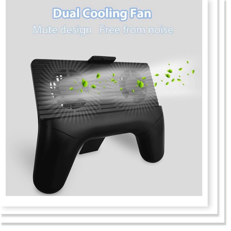 - Phần nữa trên của Tay Cầm Chơi Game là một đế tản nhiệt mini với 2 quạt tản nhiệt ở 2 bên, hút gió từ phía dưới và thổi ngược vào mặt lưng của điện thoại. Giúp tản nhiệt hiệu quả cho chiếc điện thoại khi chơi game hoặc xem phim trong thời gian dài. Đặc biệt là những chiếc điện thoại có mặt lưng bằng kim loại thì phụ kiện này là rất cần thiết. Kết hợp với phần tay cầm tích hợp, nó trở thành một phụ kiện hoàn hảo cho nhu cầu giải trí trên smartphone.