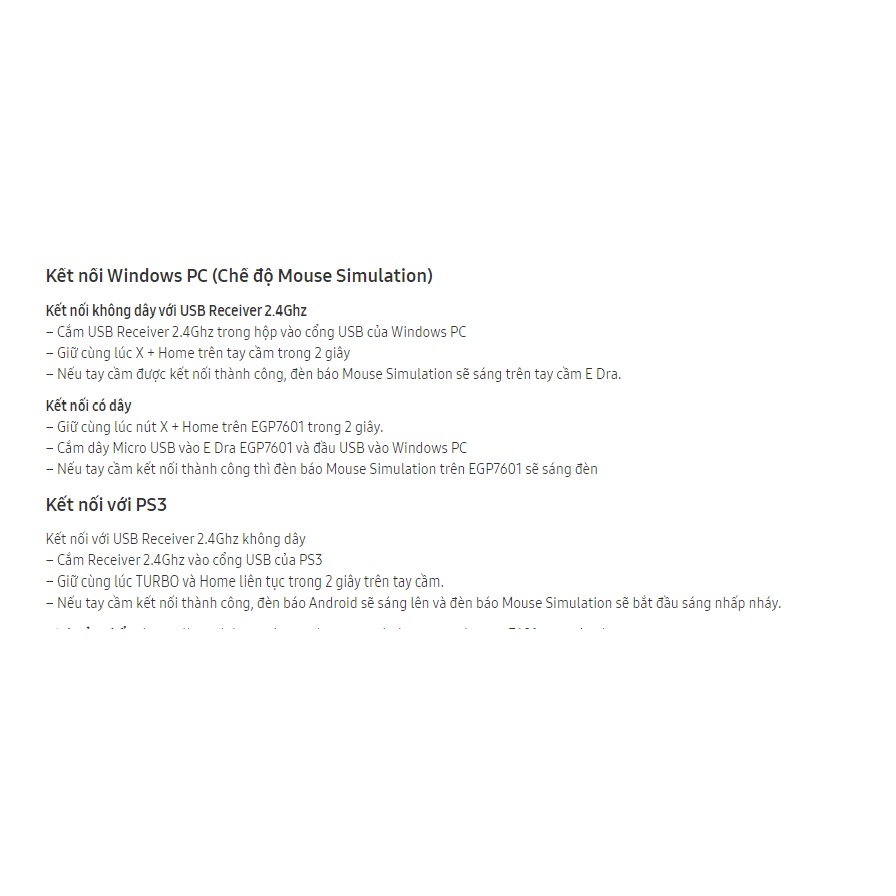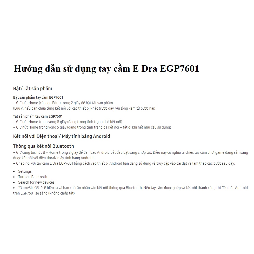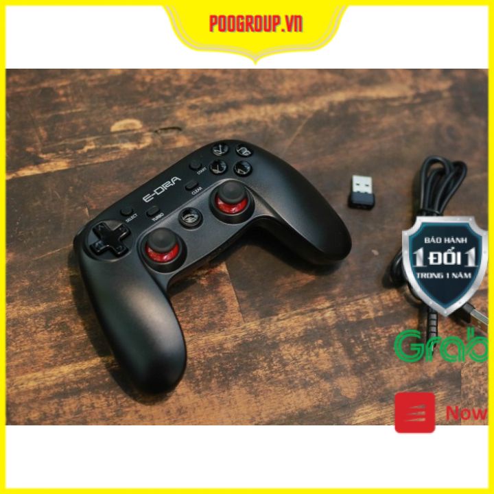 Chúng ta có thể thấy E-Dra EGP7601 mang thiết kế rất quen thuộc với cần Analog đối xứng và báng cầm tay thuôn dài (giống với tay PS4). Đây chính là lợi thế lớn khi giúp cho game thủ tiện dụng ngay từ đầu. Kích thước của tay rất vừa vặn, không quá to và không nhỏ, cầm chắc tay và trọng lượng khá nhẹ.Một trong những điểm mạnh nhất của E-Dra EGP7601 chính là hỗ trợ 2 kết nối không dây 2.4Ghz (có đầu nhận USB) và Bluetooth, điều này giúp cho tay có thể kết nối được với nhiều thiết bị, từ PC cho tới Điện thoại, TV...... EGC7601 hỗ trợ hệ điều hành Windows và Android. Hơi tiếc khi tay cầm chơi game này không hỗ trợ iOS (lý do nhà sản xuất đưa ra là phải mua bản quyền chi phí lớn, giá thành sẽ tăng lên đáng kể)
