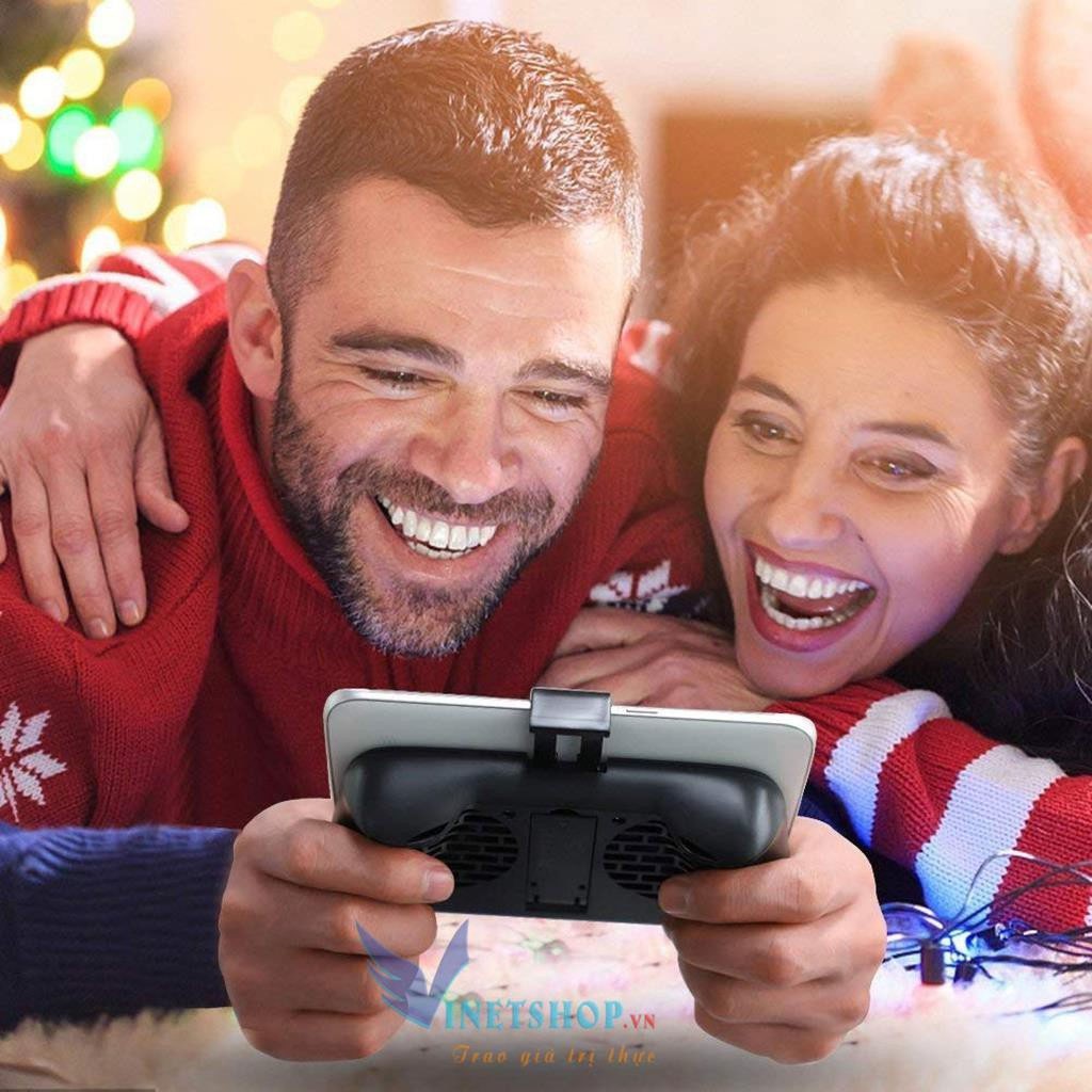 - Bên cạnh đó, tay cầm sử dụng phương thức tản nhiệt thông qua hai cánh quạt hút nhiệt. Hai cánh quạt được thiết kế chìm bên trong tay cầm, hoạt động vô cùng mạnh mẽ nên có thể phân tán nhiệt lượng trên điện thoại một cách nhanh chóng. Từ đó giúp bạn thoải mái chơi game, lướt web mà không lo nóng máy.