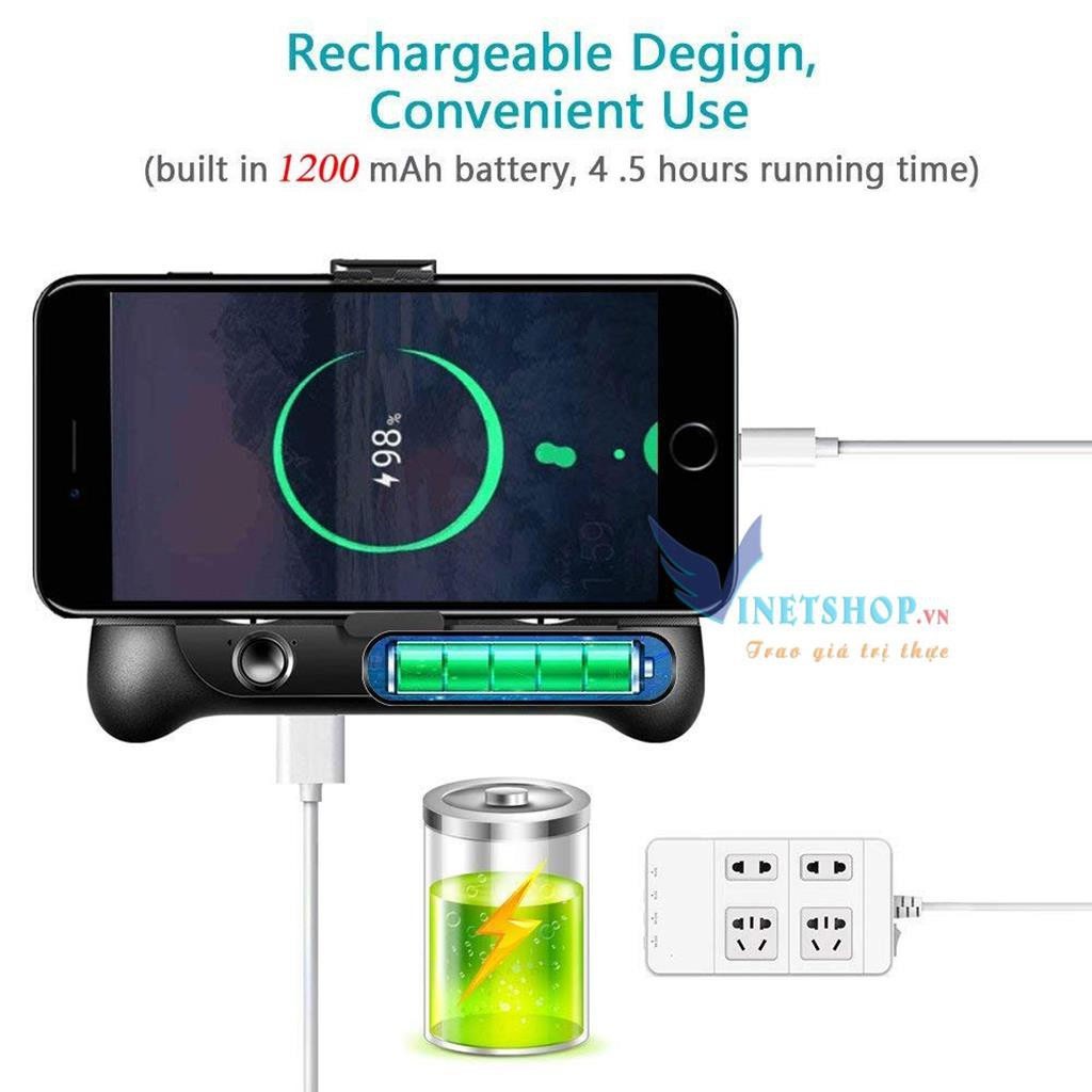 - Tay cầm được trang bị pin dung lượng 1200mAh, có khả năng hoạt động liên tục trong 2.5 đến 5 giờ. Trên tay cầm cũng có một cổng micro USB và một cổng USB thường, giúp bạn dễ dàng sạc nhanh cho thiết bị. Mặt sau tay cầm còn có cơ chế giá đỡ, có thể tháo gập tùy ý để bạn vừa có thể đặt tay cầm lên mặt phẳng vừa chơi game thay vì phải cầm trên tay.