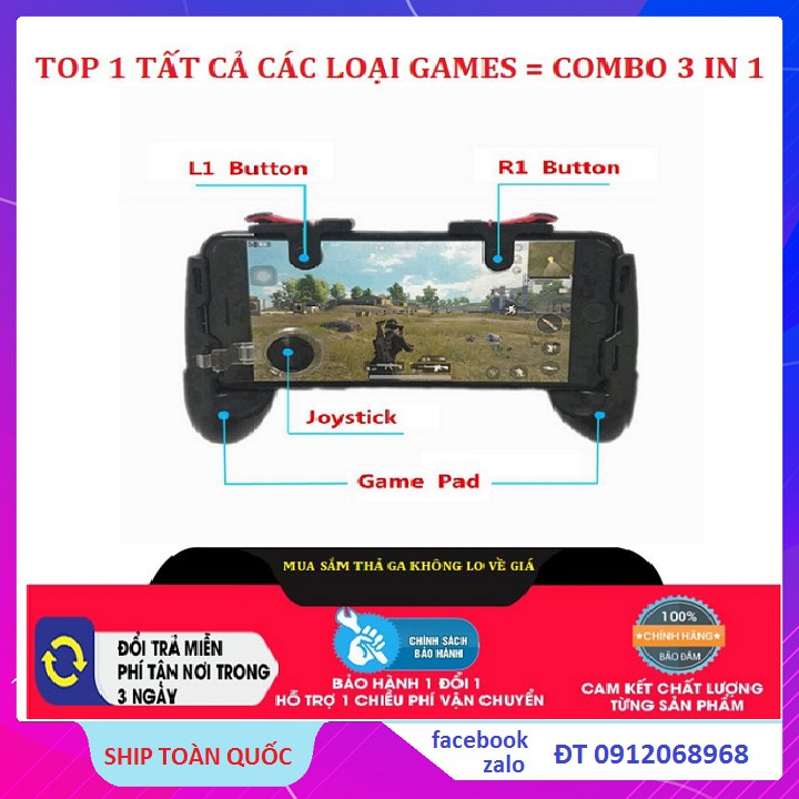 -Bộ sản phẩm 3 trong 1 gồm : Tay game kèm nút bấm + 2 nút jostick + 2 nút bấm cơ D9 cho game PUBG, ROS Free Fire,..