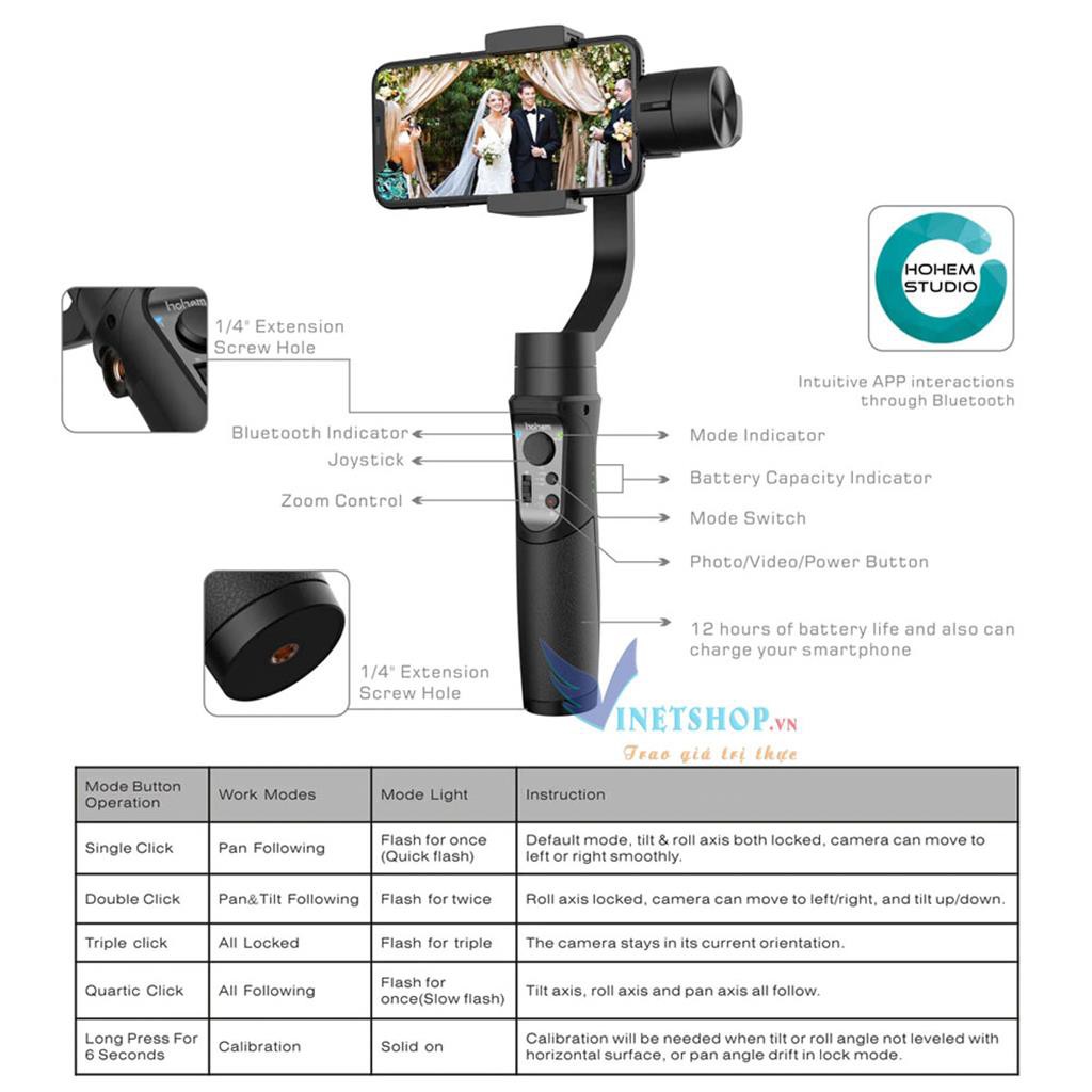 Tay Cầm Chống Rung Hohem Isteady Pro Cho Điện Thoại Mới 100% Nguyên seal Bản Quốc TếTính năng, đặc điểm: