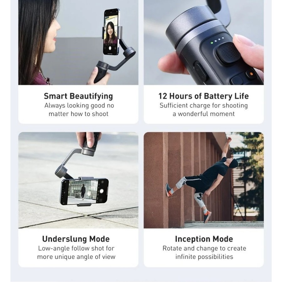 - Bên cạnh đó tay cầm vẫn giữ nguyên những khả năng tuyệt vời của bản cũ như có thể linh động chuyển phương thức sử dụng điện thoại theo hướng thẳng đứng hoặc xoay ngang, tiện lợi theo từng trường hợp người dùng muốn. Chế độ quay Timelapse, Panorama, Dolly zoom