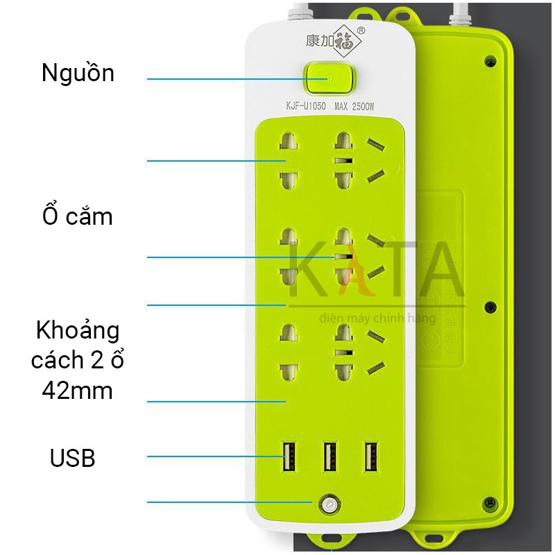 – Ổ cắm được thiết kế với 6 giắc cắm điện, cắm được các phích cắm từ 2 chấu đến 3 chấu, tròn hay dẹp đều có thể cắm được