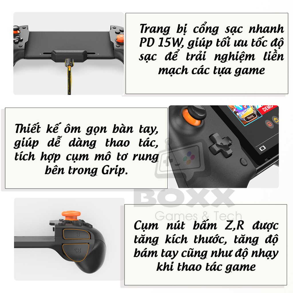 - Thiết kế thân thiện với người dùng, dạng tay cầm giúp cầm nắm dễ dàng, thao tác chơi game thoải mái, khắc phục khuyết điểm mỏi tay khi dùng lâu so với Grip chính hãng.