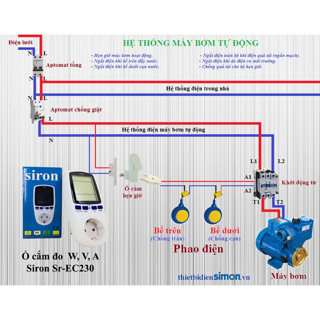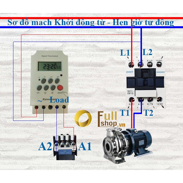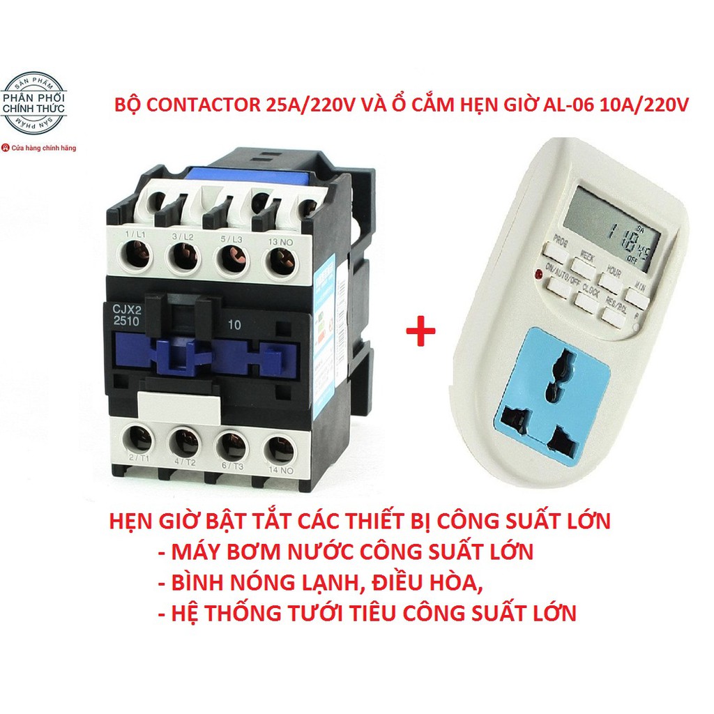 Do các thiết bị hẹn giờ tự động trên thị trường hiện nay chỉ có công suất làm việc bình thường là 5A-10A ,công suất làm việc tức thời tối đa là 16A-25A nhưng chỉ sử dụng được trong tức thời nếu thời gian sử dụng kéo dài sẽ dẫn đến phá hỏng thiết bị hẹn giờ do đó để điều khiển tự động các thiết bị có công suất cao như máy bơm nước, bình nóng lạnh, hệ thống tưới tiêu, điều hoà nhiệt độ ta phải sử dụng kết hợp công tắc hẹn giờ với khởi động từ AC contactor CJX2-2510 được thiết kế cho điện áp 220V với dòng điện tối đa 25A ( Pmax = 4.96KW) để đóng cắt tự động các thiết bị công suất lớn : động cợ 1 pha, máy bơm nước 1 pha, quạt điện, hệ thống điện chiếu sáng, bình nóng lạnh, điều hoà nhiệt độ .... Với bộ thiết bị như trên: Ổ cắm hẹn giờ AL-06có tác dụng cấp điện đóng tiếp điểm cho Contactor 25A/220V rồi từ đó cấp điện cho phụ tải qua trung gian là contactor 25A/220V do đó dòng điện làm việc của phụ tải không đi qua trực tiếp Ổ cắm hẹn giờ AL-06 nên không ảnh hưởng tới sự an toàn của Ổ cắm hẹn giờ AL-06 đảm bảo sự ổn định của Ổ cắm hẹn giờ AL-06 và nâng cao độ bền của Ổ cắm hẹn giờ AL-06 công tắc hẹn giờ sẽ không bị hỏng hóc do công suất dòng điện đi vào phụ tải quá công suất tối đa của công tắc hẹn giờ.