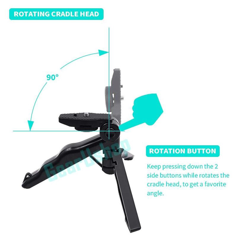 GỒM TAY CẦM KIÊM TRIPOD VÀ KẸP 360 Mô tả: Kích thước: Kích thước gấp gọn: 16 X 7.5 X 3CM Chiều cao giá đỡ ba chân: 10CM Chất liệu: Vòng bi nhựa ABS Trọng tải có thể chịu được: 0.5kg Chiều rộng giá đỡ điện thoại: 55 - 105mm Lưu ý: Không bao gồm máy ảnh, vỏ, điện thoại di động. #TAYCAM #360Giá NUNU