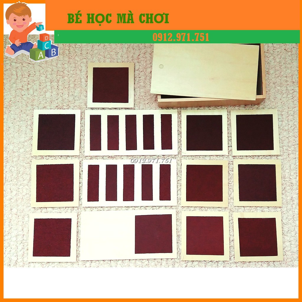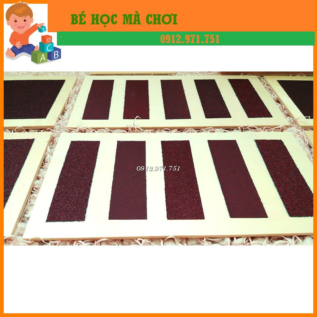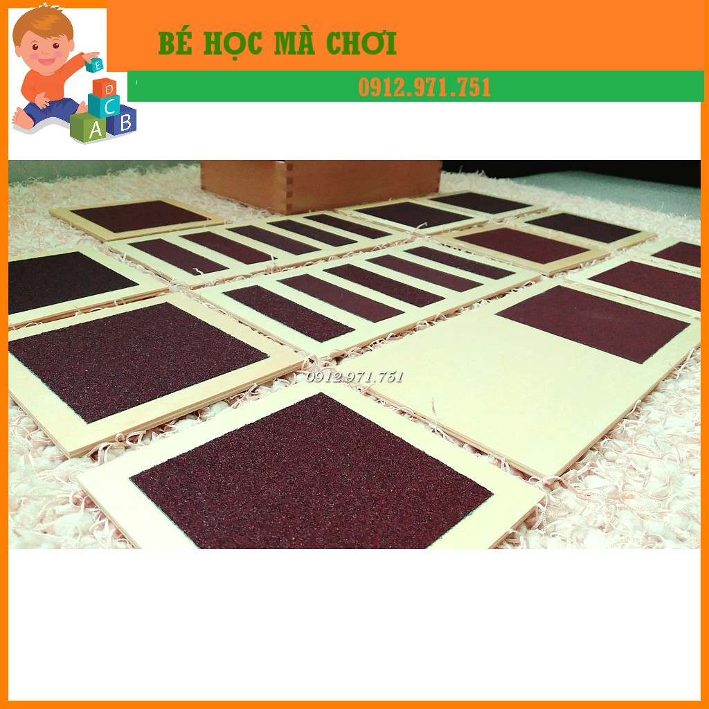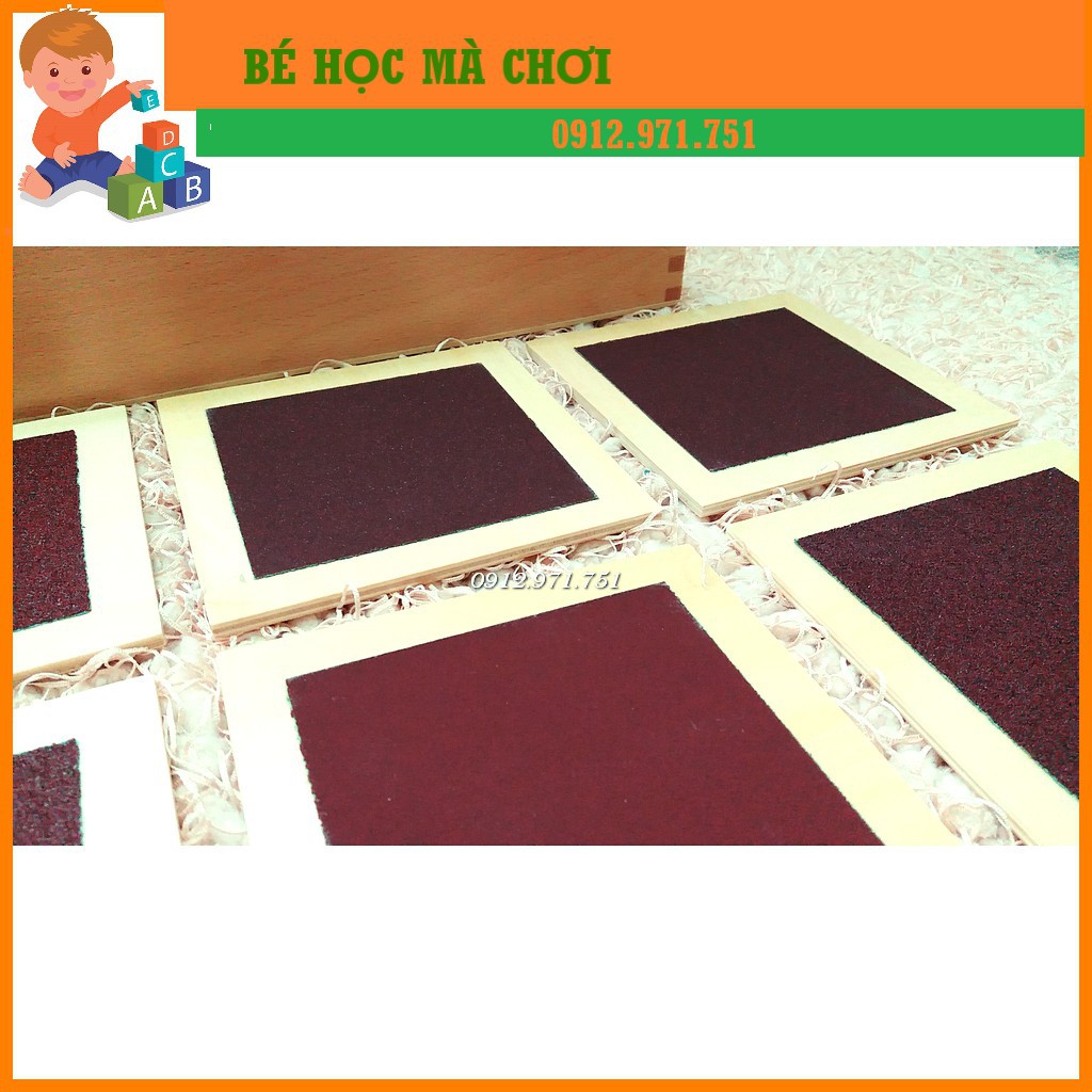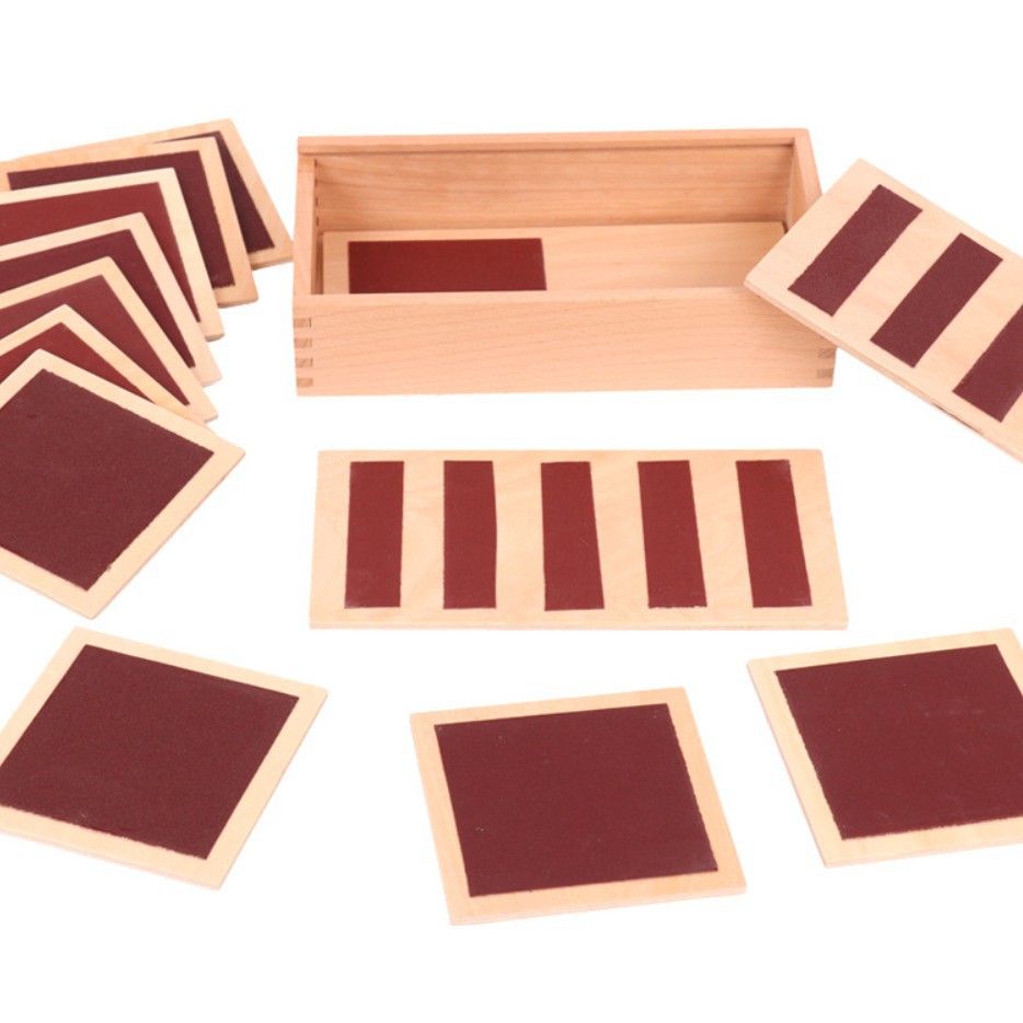 Sản phẩm bao gồm bộ 5 cặp bảng có độ thô và mịn khác nhau được đựng trong một hộp gỗ. Giúp trẻ phát triển xúc giác.