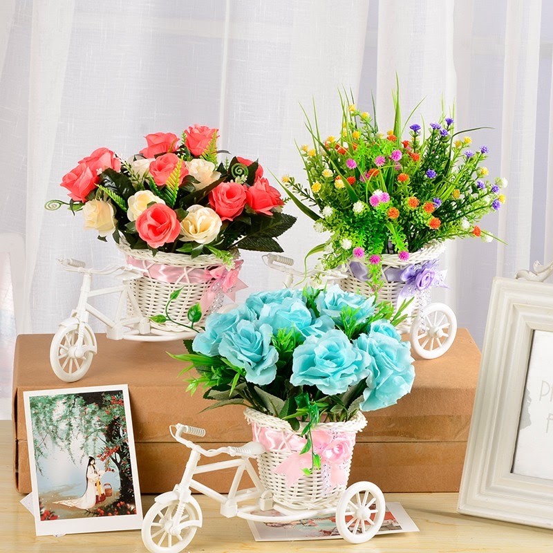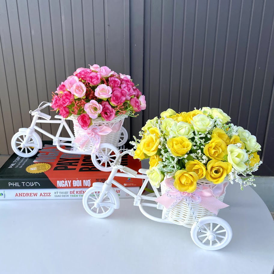 Nhà cửa & Đời sống > Trang trí nhà cửa > Hoa trang trí || (Cắm sẵn) Xe đạp nhựa kèm hoa tỉ muội, trà bi, hướng dương, cánh bướm, chiêm điểm - Lọ hoa giả - Trang trí, để bànCòn hàng