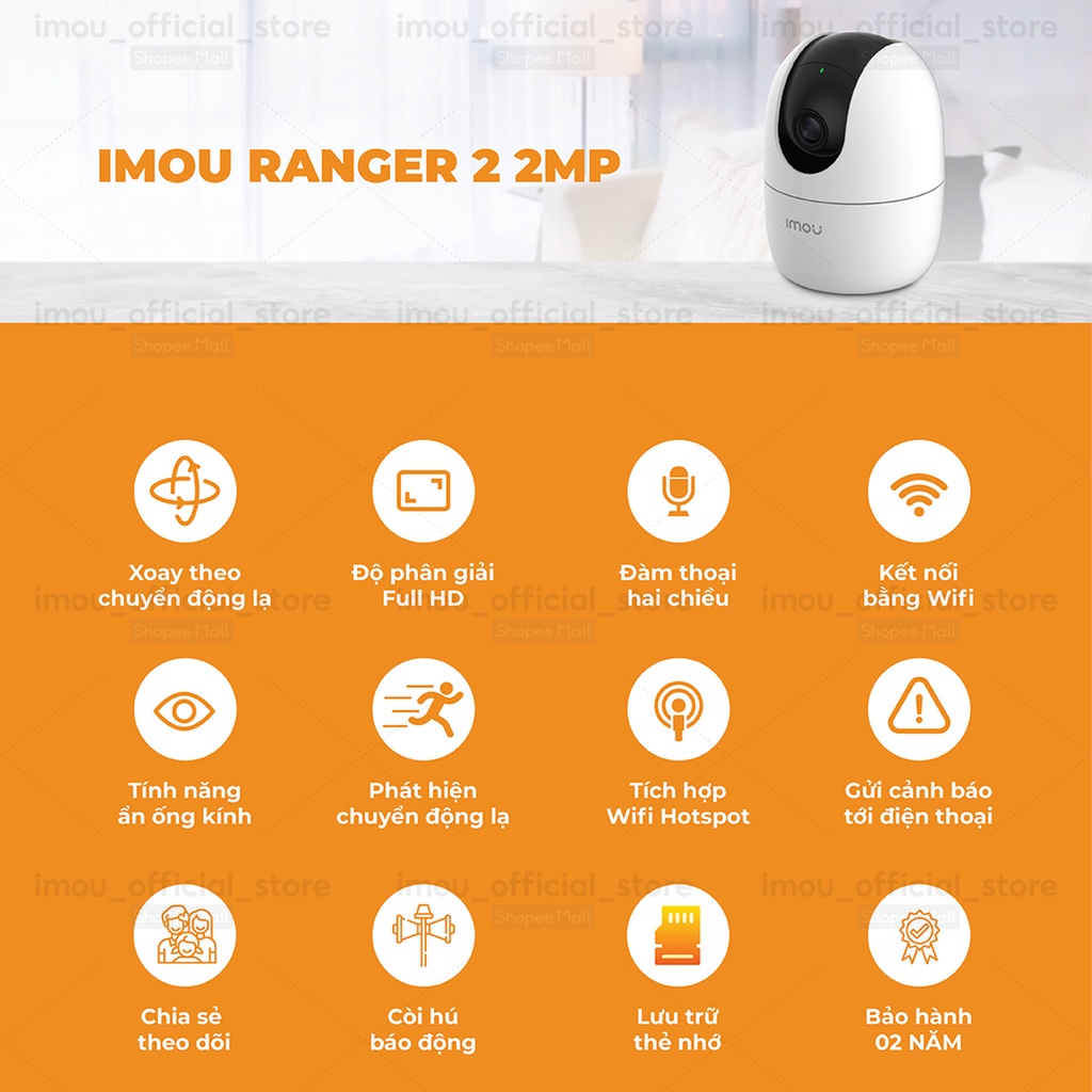 • Camera 360 Ranger2 1080P IP Imou IPC-A22EP (Sản phẩm chưa bao gồm thẻ nhớ)• Độ phân giải 2Megapixel CMOS 1/2.7" (1080P)