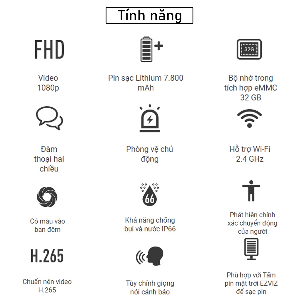 – Có thể hoạt động 210 ngày khi sạc đầy pin (Có thể kết hợp với tấm pin mặt trời Ezviz để sạc trực tiếp)