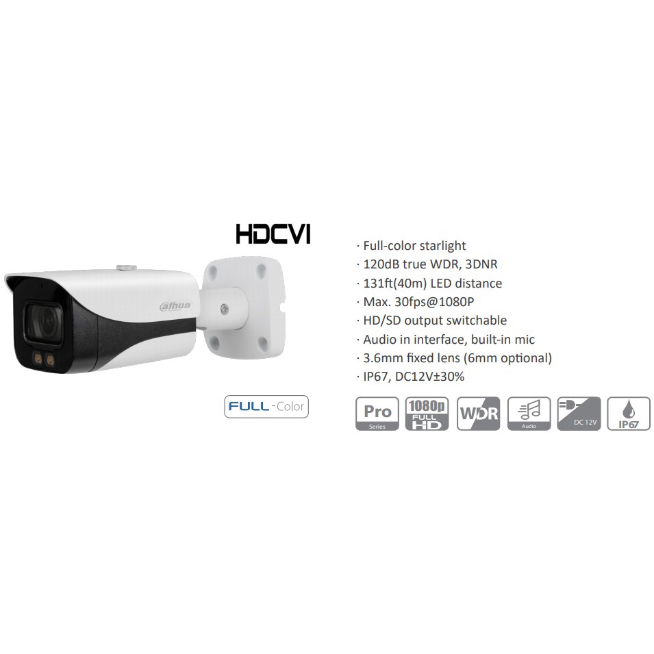 Camera Dahua 2249EP-A-LED Full Color có màu ban đêm có mic■ Độ phân giải #2MP full-color Starlight HDCVI, cảm biến CMOS 1/2.8"- Cho hình ảnh có màu trong môi trường ánh sáng cưc thấp, 25/30fps@1080P, Thời gian thực không trễ hình, ngõ ra tín hiệu đồng thời 1 cổng BNC HDCVI và một cổng BNC analog (DIP switch).